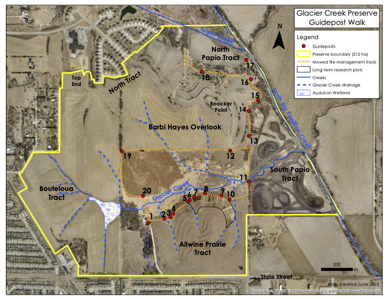 Guidepost Walk: Fifteen guideposts are scattered along the 2.4 km (1.5 mi) fire track that takes you around the Allwine Prairie Tract with an additional 5 posts located along a 1 km (0.6 mi) sidetrack (Figure 1). The fire track is the boundary between the Preserve’s different burn units, so it is regularly mowed. The twenty numbered guide posts are the product of significant time and effort of Miles Divis in completion of his Eagle Scout project. Mile’s efforts were supported by other members of his Troop 99 as well as by members of their respective families.