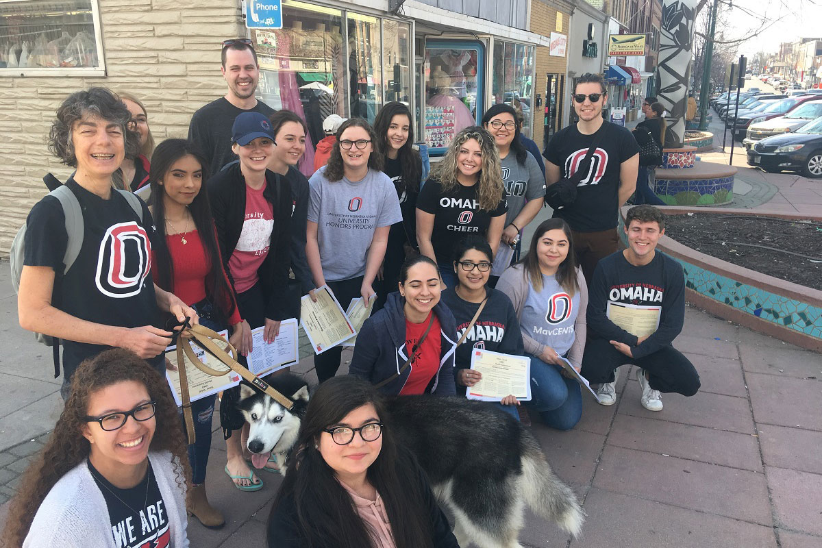 SPAN 4030/8036 students are participating in a service-learning project developed in conjunction with the Heartland Workers Center to promote voter registration and voter participation. The project requires students to conduct group canvassing in South Omaha, which is the part of the city with the greatest concentration of Spanish speakers. Students have an opportunity to converse in Spanish with a broad array of Hispanic citizens, under supervision at first and eventually on their own.