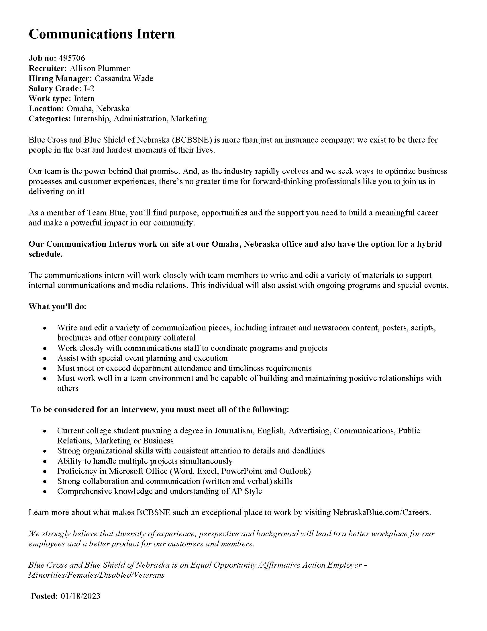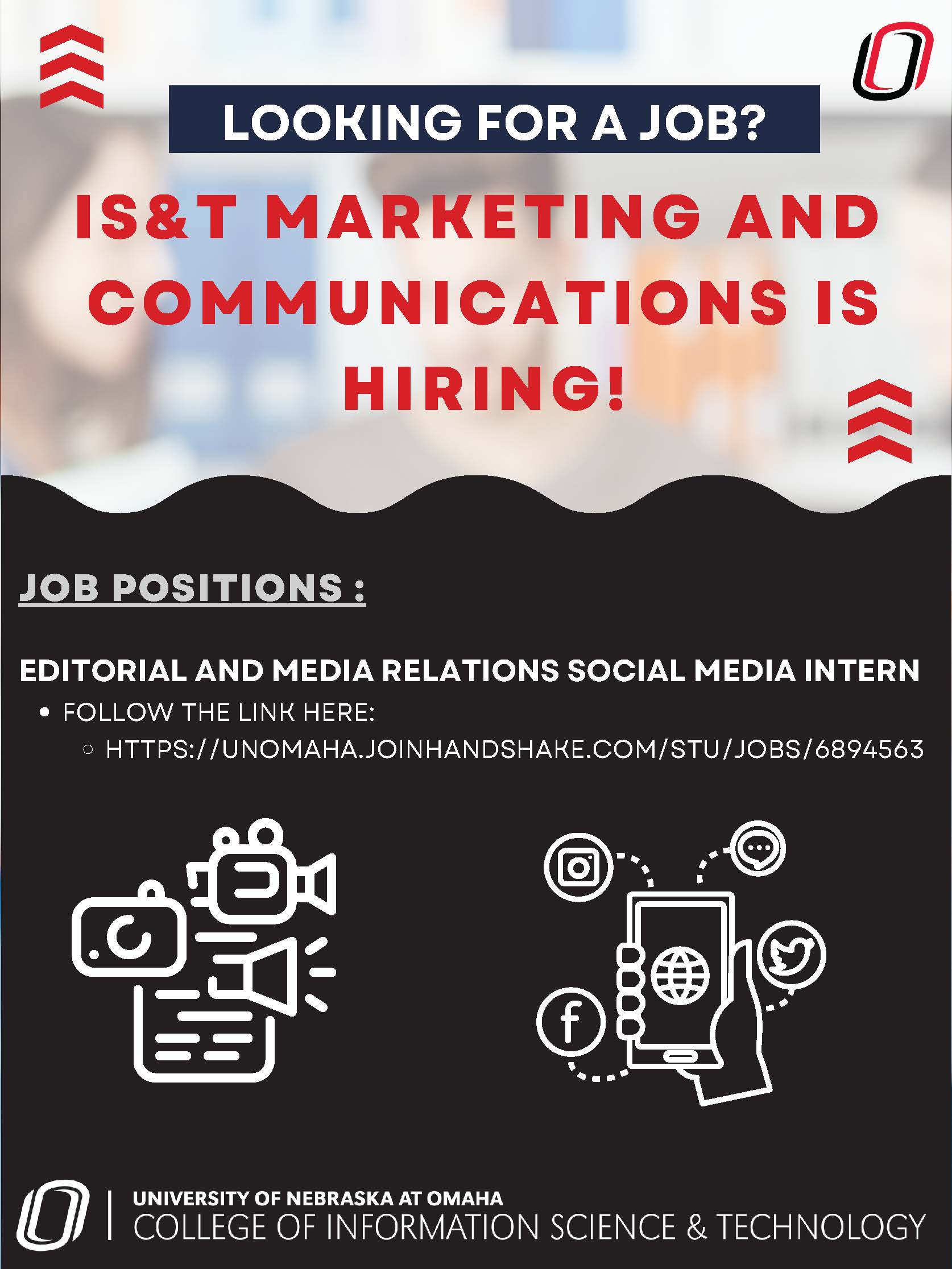 Ways you’ll make an impact: Assist the University of Nebraska at Omaha Alumni Association communications team with writing and creating content; developing marketing materials; event photography; and generating story ideas. Assist with planning and developing a new UNO Alumni website. Assist with alumni engagement events and programs. Provide your perspective as a student on various projects advancing the UNO alumni experience. To learn more, please visit the complete job posting.