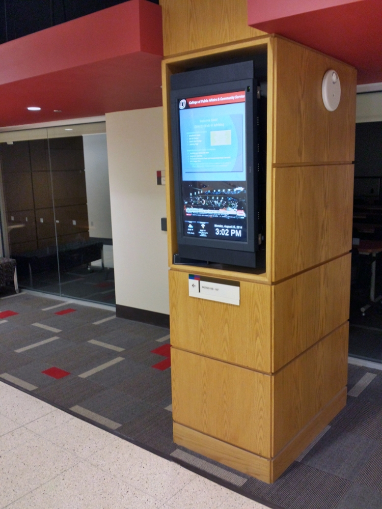 Three digital screens are located on the first and second floors of the CPACS Building. One of the first floor screens, plus the screen on the second floor, has space available to post information about CPACS or limited campus-wide events.