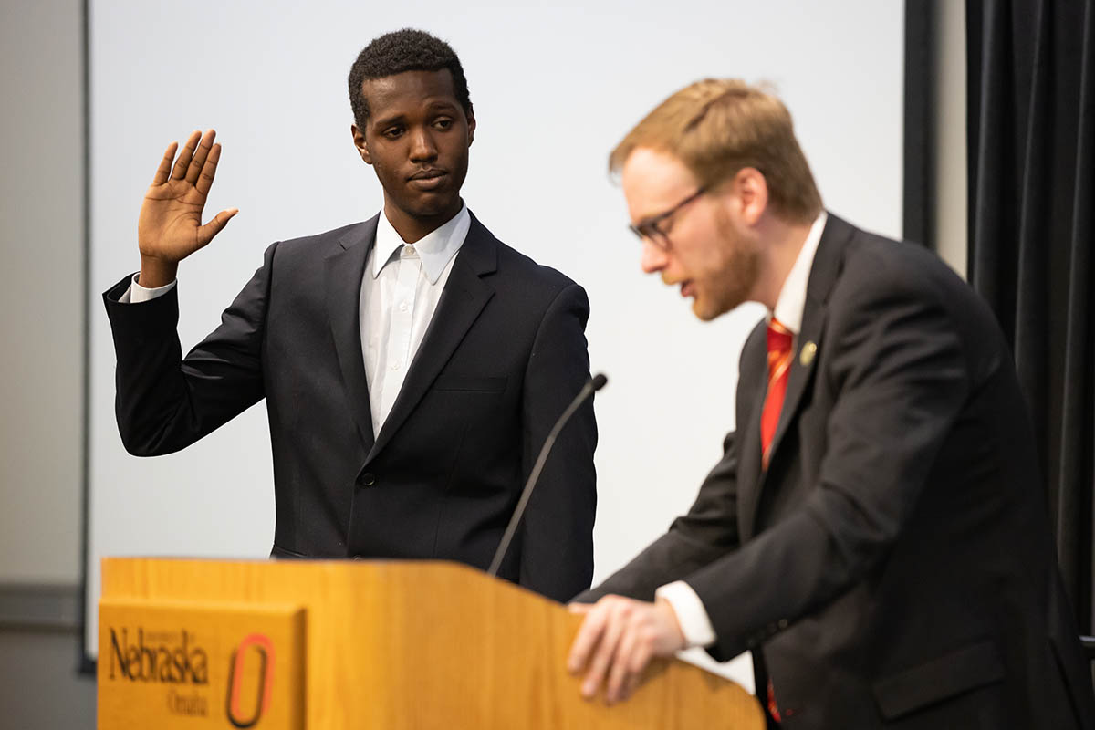 Ostdiek and Garofalo were sworn in by Emma Ehmke, the Chief Student Court Justice. University of Nebraska (NU) System Chief of Staff Phil Bakken swore in Lotoro and welcomed him as the new Student Regent.
